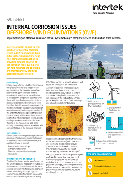 From experienced staff supporting you with desktop studies of the geophysical challenges when planning a new windfarm, to highly competent inspectors to support your supply chain management work, through to oil condition monitoring, structural health monitoring and operational support, Intertek’s dedicated team will help you create green energy quickly and cost-effectively. Some of the technical innovations our team deploys globally include total stations for 3D scanning of foundations to ensure everything will fit first time; drones for safe inspection of lightening inspection systems and blades; and the latest subsea robots to remotely inspect for corrosion and structural issues in foundations subsea. Each service is backed by a competent laboratory service with engineers, inspectors and technicians ready to support the global supply chain and the hundreds of operational and planned offshore wind farms around the world.